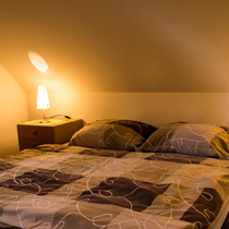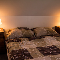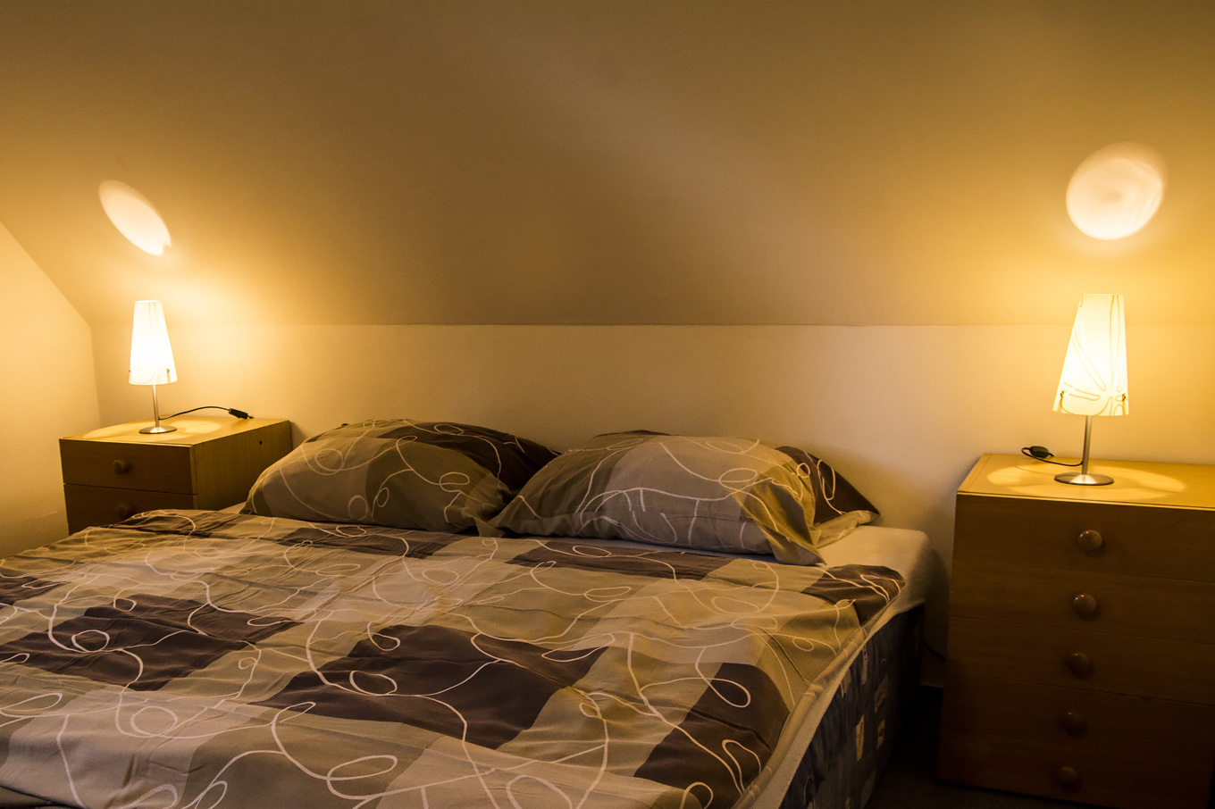 Ložnice: postele, noční stolek s lampičkou, 1x dětská cestovní postýlka