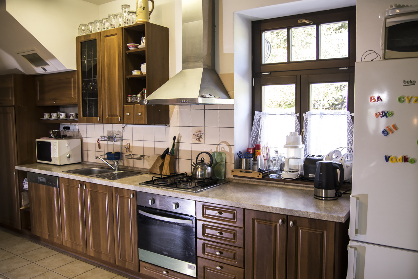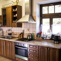 Kuchyně: kuchyňská linka, lednice s mrazícím boxem, mikrovlná trouba, plynový sporák s elektrickou troubou, myčka, toustovač, topinkovač, nádoby na vaření včetně kuchyňského vybavení