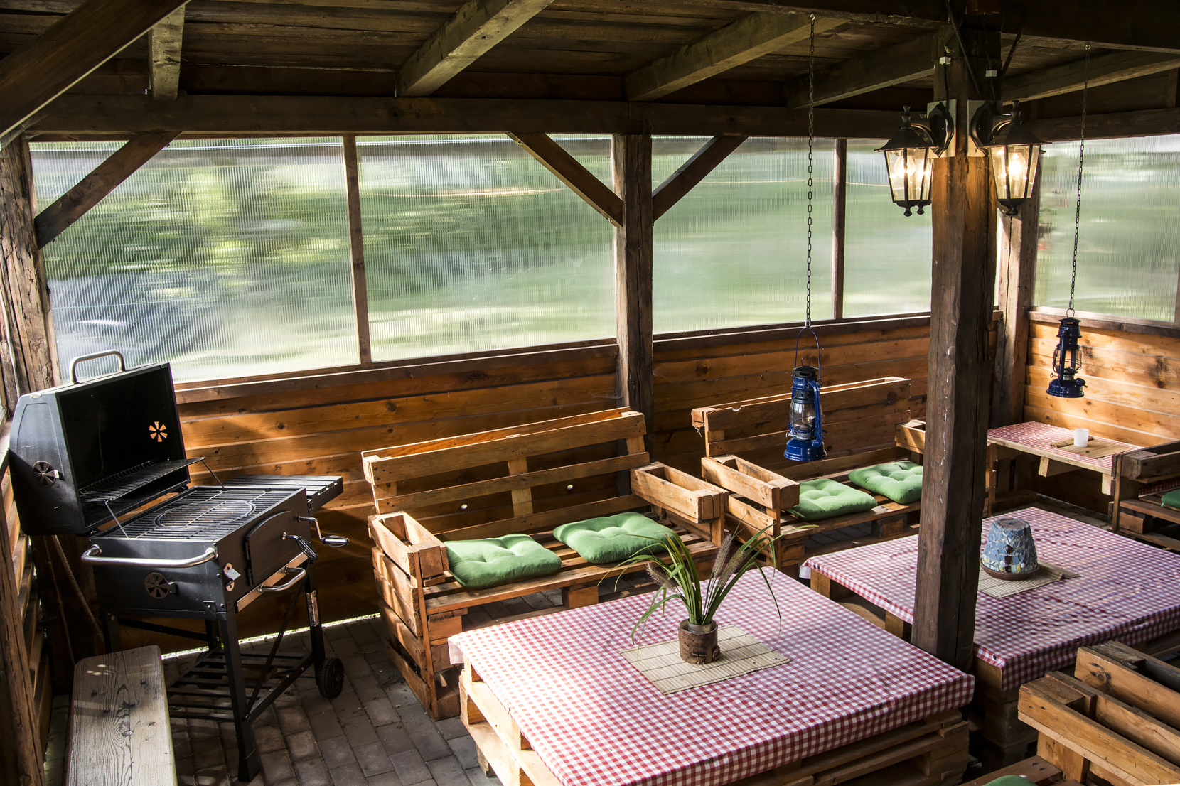 Venkovní posezení pod pergolou s grilem na dřevěné uhlí, venkovní otevřené ohniště s posezením.