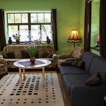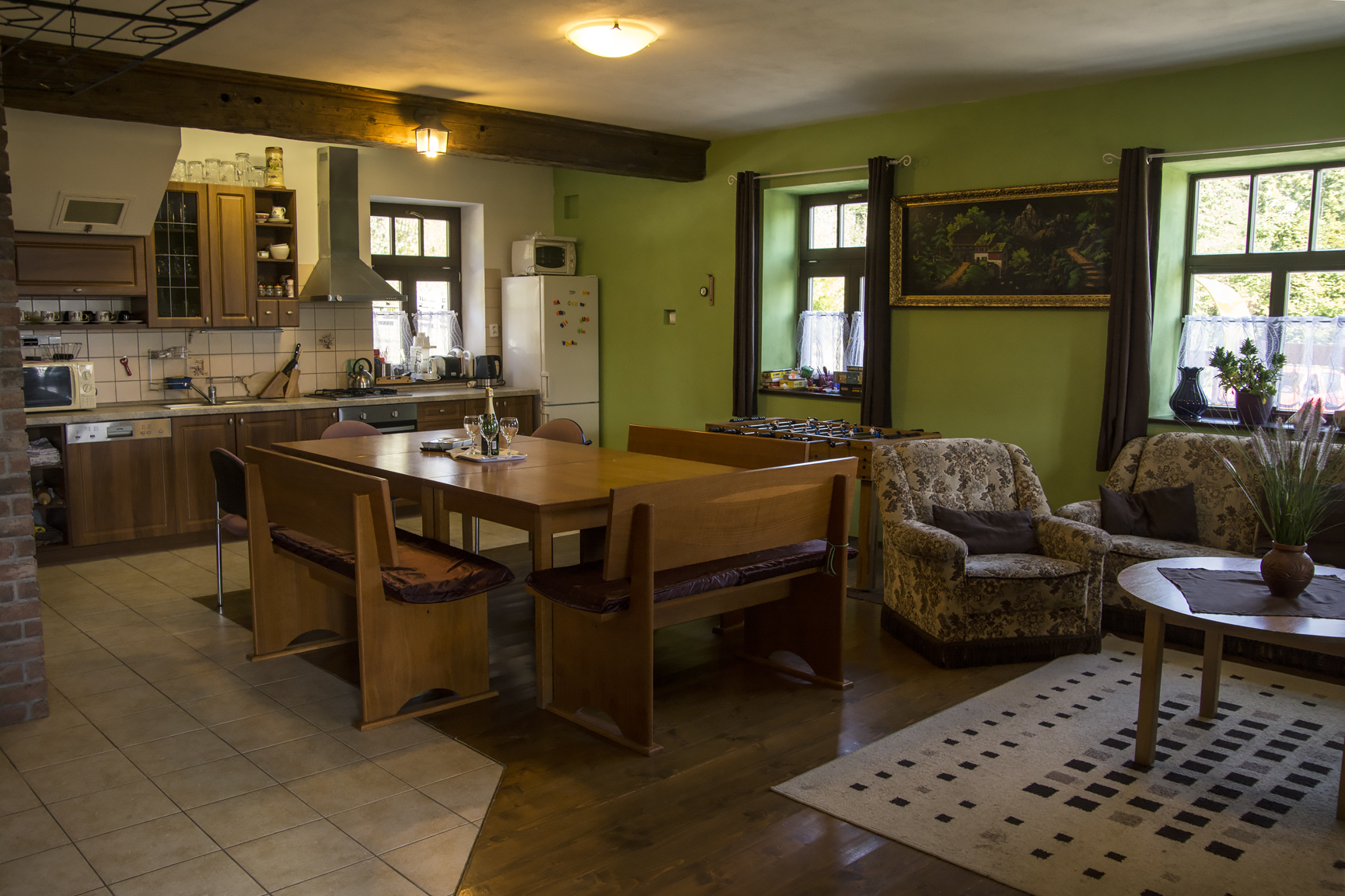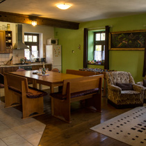 Společenská místnost: jídelní stůl, židle + lavice, dále pak sedačka a křesla s konferečním stolkem, televize