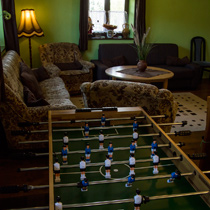 Vnitřní hrací kout pro děti se stolním fotbálkem, stolními hry, stavebnicemi, hračkami pro děti.